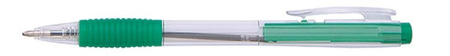 długopis automatyczny z wymiennym olejowym wkładem obudowa zaprojektowana specjalnie pod kątem ergonomii gumowy uchwyt gwarantujący komfort pisania transparentna obudowa pozwalająca kontrolować stopień zużycia tuszu klips w kolorze tuszu tusz wodoodporny średnica kulki: 0,7mm grubość linii pisania: 0,5mm kolor: zielony