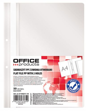 Skoroszyt OFFICE PRODUCTS, PP, A4, 2 otwory, 100/170mikr., wpinany, biały