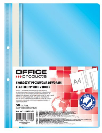 Skoroszyt OFFICE PRODUCTS, PP, A4, 2 otwory, 100/170mikr., wpinany, jasnoniebieski