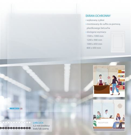 Ekran wykonany z przezroczystego plexi o grubości 3 mm lub 5 mm. Montowany do sufitu za pomocą plastikowego łańcucha (średnica 3,2 mm; w kolorze czarnym lub białym).